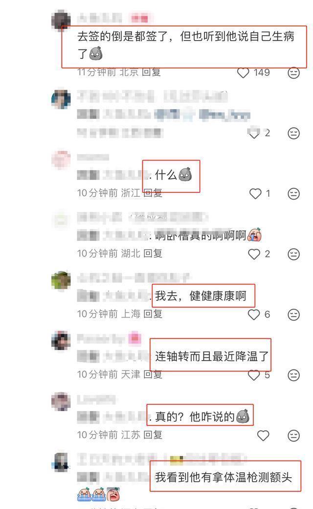 坐下休息的时候,手里拿出纸巾,不少人怀疑他感冒了,还有在那里的粉丝现身说法说听到他说生病了。 大家也看到在机场的时候,他拿体温枪测量额头。